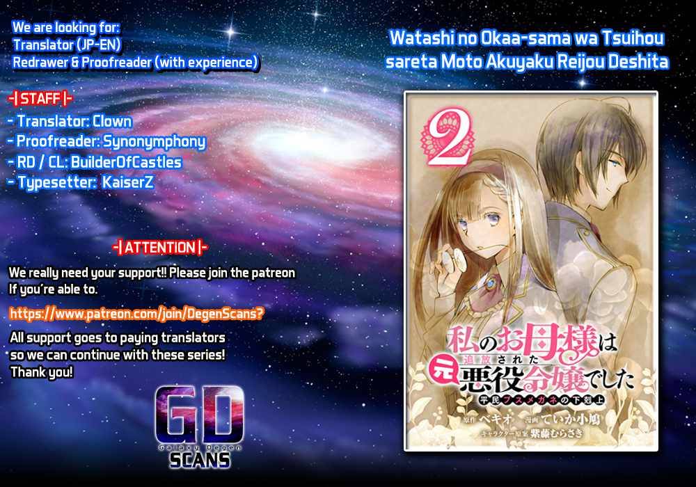 Watashi no Okaa-sama wa Tsuihou sareta Moto Akuyaku Reijou Deshita – Heimin Busu Megane no Gekokujou - Chapter 2